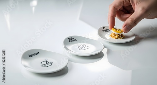 A chef's hand delicately assembles a miniature gourmet meal on tiny plates, representing a full-course dining experience