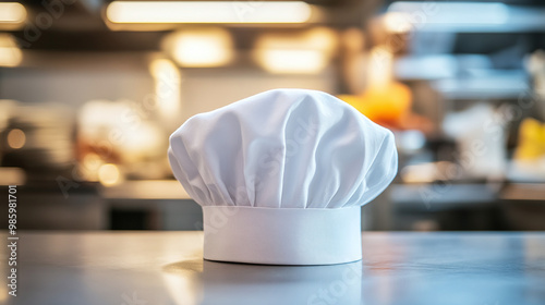 A chef's hat lies on the kitchen surface in a restaurant kitchen