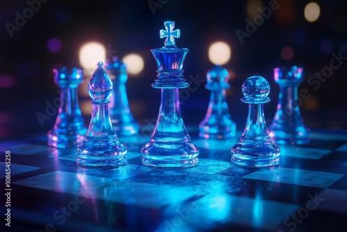 A chessboard with chess pieces, illuminated by dynamic lighting effects. The background is dark, creating an atmosphere of intense competition