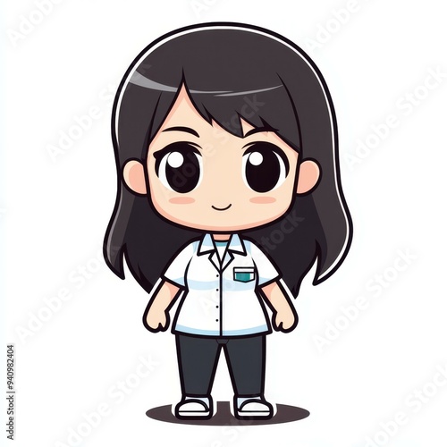 A chibistyle girl in work clothes walks confidently with her hands in front against a clean white backdrop.