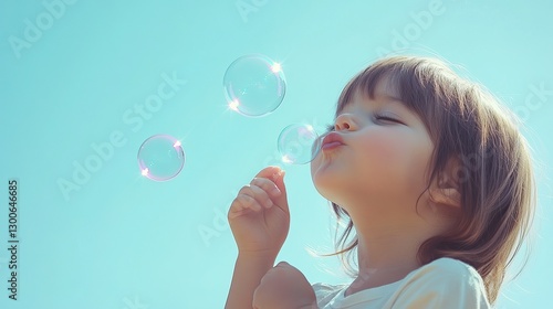 A child blows bubbles into the air against a soft sky-blue background. Playful moments. Concept of innocence, joy, and lighthearted fun.