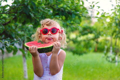A child eats a watermelon in the park. Selective focus.