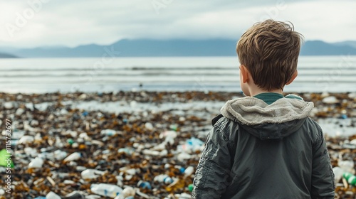 A child facing a vast ocean littered with plastic waste, the sky above them a dull gray, capturing the despair of environmental degradation