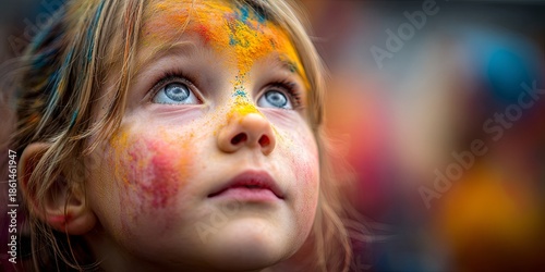 A child s eyes looking up with wonder at a street parade, blurred festive background, vibrant colors, capturing innocence and curiosity, candid emotion.