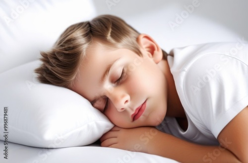 A child sleeps on a bed with white sheets. Healthy sleep concept.