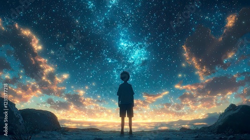 A child stands alone, gazing at a breathtaking night sky filled with stars and a magical sunset. A dreamy landscape of serenity and wonder.