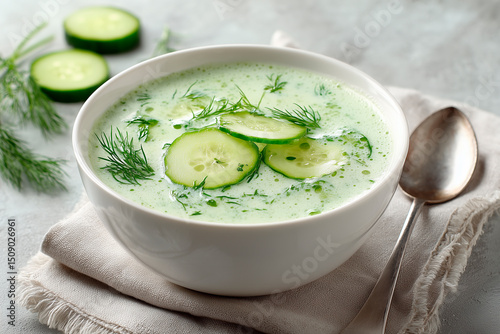 A chilled cucumber soup in a white ceramic bowl, garnished with fresh dill and thin cucumber slices, on a light stone surface with a linen napkin