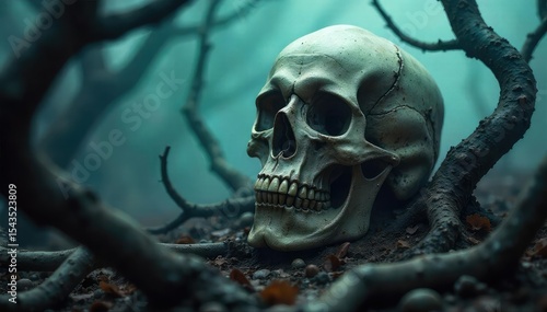 A chillingly realistic depiction of a decaying skull amidst gnarled branches, shrouded in an eerie mist Perfect for Halloween, horror, gothic, and dark fantasy projects , spooky, haunted