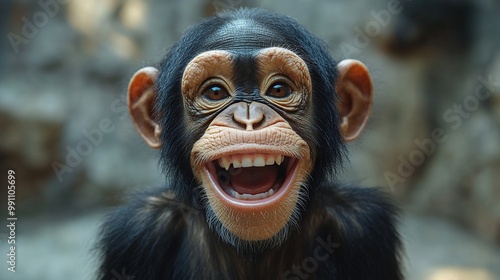 A chimpanzee's broad smile is captured against a gray backdrop.