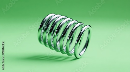 spring, metal, chrome, coil, shiny, reflective, green, background, shadow, light, object, cylindrical, smooth, curve, spiral, energy, bounce, tension, compression, pliable, flexible, metallic, gleam, luster, bright, vibrant, abstract, minimalist, simple, design, graphic, illustration, three-dimensional, three-dimensional, render, geometry, shape, form, structure, coiled, loop, circular, ring, glossy, polished, sleek, modern, clean, pastel