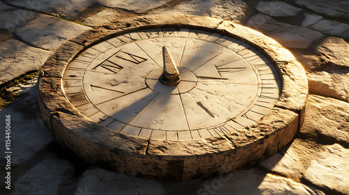 A circular stone sundial with a shadow cast on its surface. Sundial. Illustration