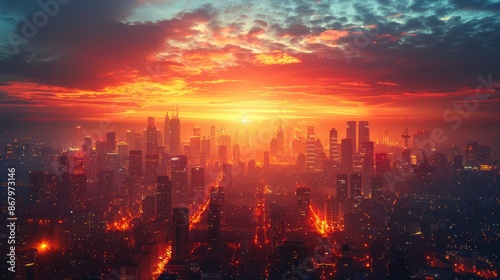 horizontal, photo, outdoors, color image, no people, architecture, city, city landscape, skyscraper, modern, building exterior, travel destination, sky, sunlight, city life, sunset, travel, dusk, business, tower, morning, sun, residential area, aerial view, financial district, binnenstad, dramatic sky, famous place, built structure, capital city, environment, orange color, apartment, dawn, development, economy, copy space, night