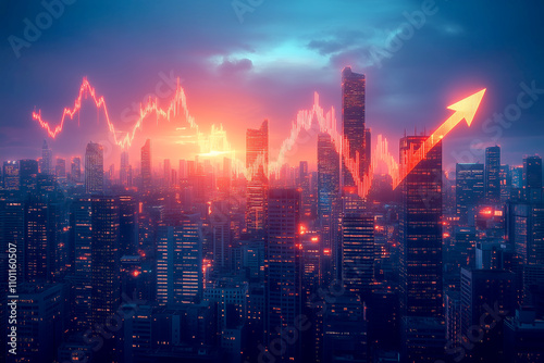 A cityscape view with a large, glowing arrow pointing upward in the sky, representing economic growth and sales performance