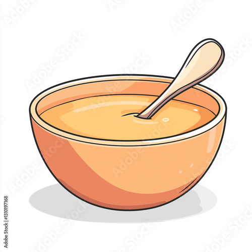 A classic peach-colored bowl filled with creamy soup, with a spoon inside. A simple and elegant vector illustration ideal for food, cooking, and warm meal themes.