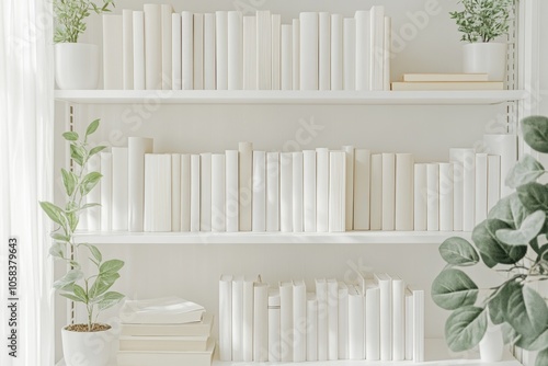 A clean and modern bookshelf filled with white books arranged neatly, complemented by small