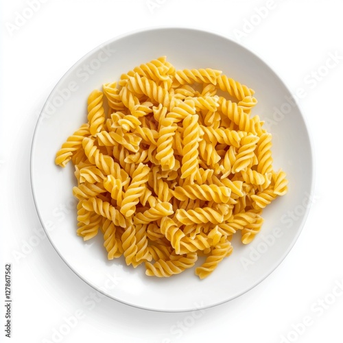 A clean, minimalistic image of macaroni pasta on a white plate, with no sauce, isolated on a pure white background.