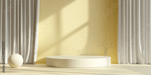 A clean podium in a soft pastel yellow with light grey curtains, lightly illuminated for a fresh, inviting product showcase.
