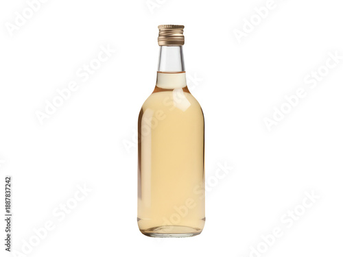A clear glass bottle filled with liquid on a white surface, ideal for use in product or advertising photography
