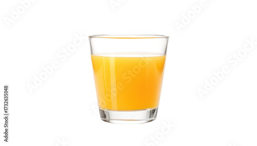 A clear glass filled with orange juice sits on a clean white surface. reflecting light and its refreshing appearance. ideal for beverage-related content