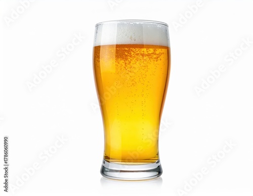 A clear glass of golden beer with a frothy head, isolated on a white background, ideal for beverage and bar-related concepts.