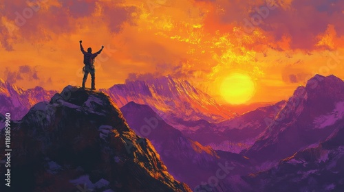 A climber celebrates on a mountain peak during a vibrant sunset.