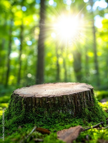 A close up of a lush green tree stump surrounded by sunlight - A serene tree stump surrounded by vibrant greenery and dappled sunlight symbolizing nature, growth, tranquility, renewal, and harmony