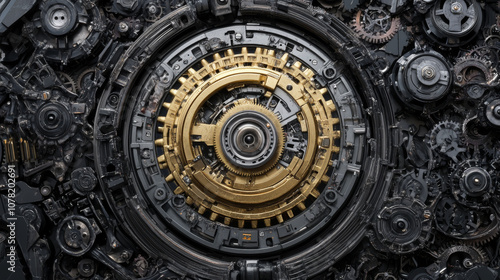 A close up of a machine with many gears and a gold circle in the middle