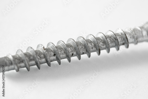 A close up of a screw on white background