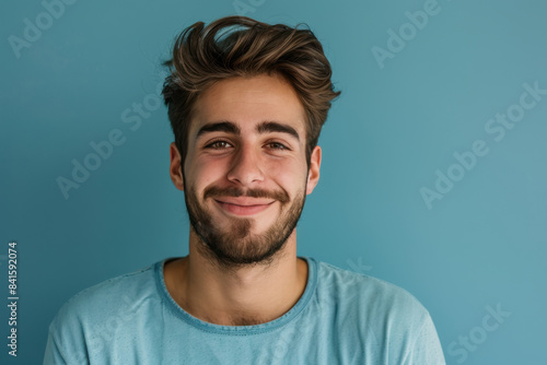 A close up portrait of a young man with a subtle smile