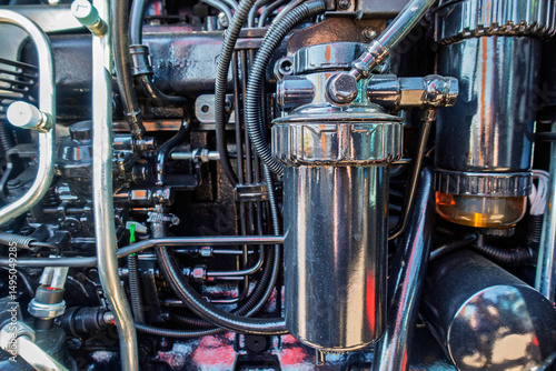 tractor, engine, machine, equipment, mechanic, machinery, motor, agricultural, technology, repair, industry, metal, industrial, automotive, part, auto, vehicle, engineering, steel, power, detail, closeup, agricultural machinery, maintenance, mechanical, metallic, construction, farm, fuel, system, component, pipe, filter, heavy, transport, mechanism, closeup, technical, connection, shiny, chrome, design, hardware, gear