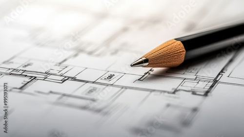 A close-up image of a pen and pencil lying on top of a blueprint. The blueprint shows architectural plans with dimensions and labels.