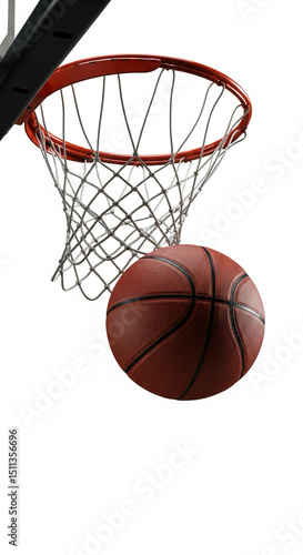 A close-up of a basketball flying into the hoop, frozen mid-air, sharp shadows, isolated on a white background, professional lighting