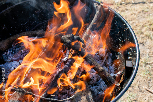 A close-up of a campfire burning brightly in a barbecue grill, representing outdoor cooking and summer gatherings