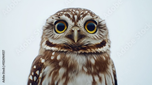 A close-up of a curious owl with large, round eyes and intricate feather patterns.