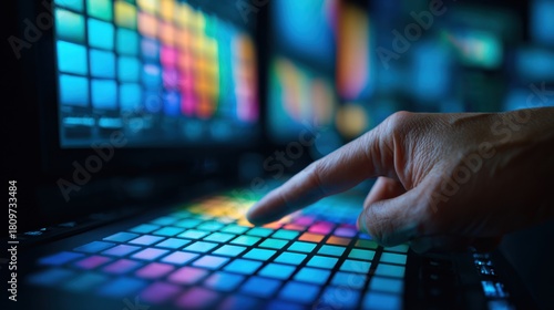 A close-up of a hand touching a vibrant, multi-colored touchpad, suggesting interaction with digital technology or creative tools.