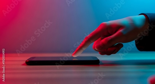 smartphone, hand, touching, screen, neon, blue, red, cyan, magenta, technology, mobile, digital, dark, wood, table, desk, finger, interaction, glow, futuristic, cinematic, lighting, contrast, communication, app, cyberspace, connection, modern, minimalist, gaming, cyber, security, electronic, device, black, surface, blurred, background, bokeh, closeup, shadow, touch, wireless