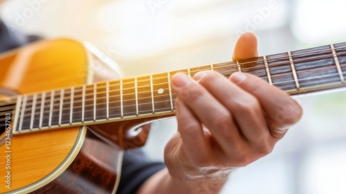A close-up of a musician’s hands playing an acoustic guitar, capturing the details of the strings, frets, and sunlight reflections. Ideal for music, creativity, and artistic inspiration.