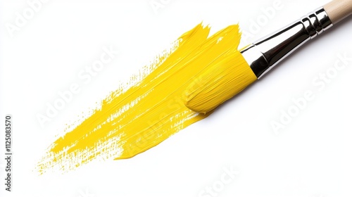 A close-up of a paintbrush with vibrant yellow paint streaked across a white canvas.