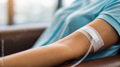 A close-up of a patient's arm with a medical IV line attached, showcasing a healthcare setting.