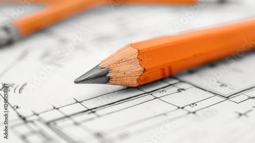 A close-up of a pencil on top of a blueprint paper plan design. generative AI image