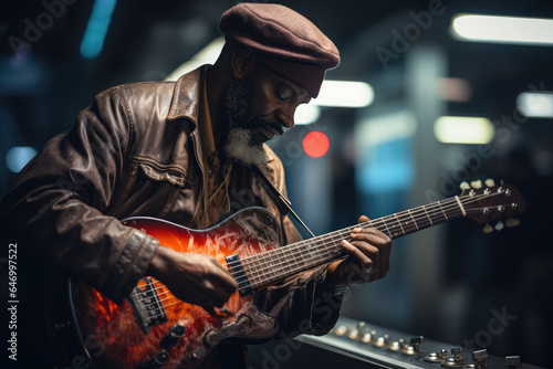 A close-up of a person's hand playing a musical instrument in a subway station, adding art to urban spaces. Generative Ai.
