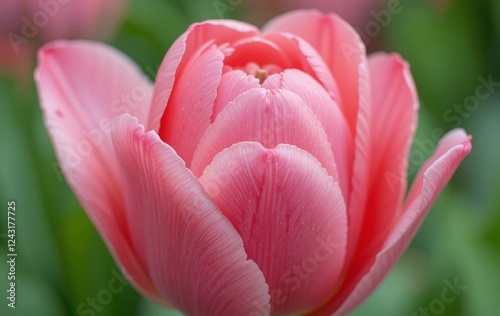 A close-up of a pink tulip with dew drops on its petals