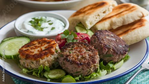 plate, closeup, lamb, beef, served, side, cucumber, yogurt, pita, bread, middle, eastern, savoury, dish, juicy, ai, flavorful, grilled, minced, meat, tender, spice, garlic, cumin, parsley, herb, texture, delicious, dipping, sauce, warm, aromatic, traditional, protein, filling, presentation, culinary, snack, serving, rich, hearty, appetiser, fresh, creamy, lemony, crispy