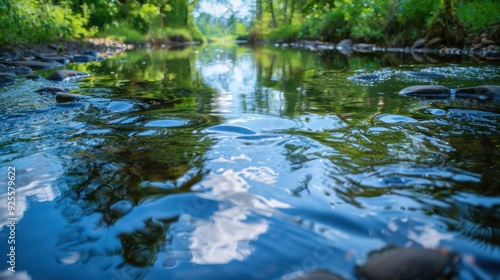 A close-up of a river's surface, reflecting the blue sky and surrounding trees, capturing the beauty of nature.