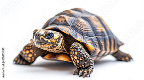 A close-up of a tortoise walking on a white surface, showcasing its intricate shell patterns