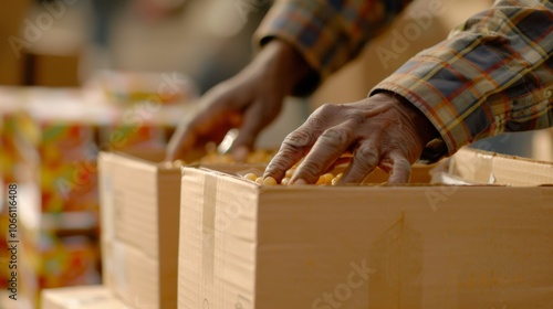 closeup, volunteer, hand, gently, packing, box, food, delivery, individual, public, space, background, wallpaper