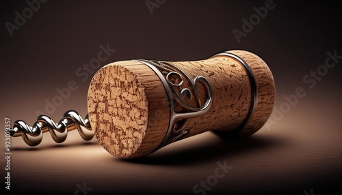 A close-up of a wine cork and a corkscrew, set on a plain surface with minimal background di