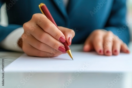 A close-up of a woman's hand elegantly holding a pen, ready to write on a blank sheet of paper in a professional setting.