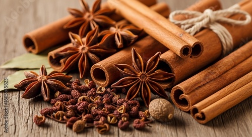 A close-up of aromatic whole spices like cinnamon sticks, star anise, nutmeg, and peppercorns on a wooden table.