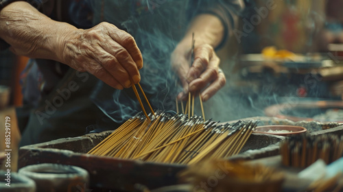 A close-up of hands delicately crafting incense sticks, with a focus on the precision and craftsmanship